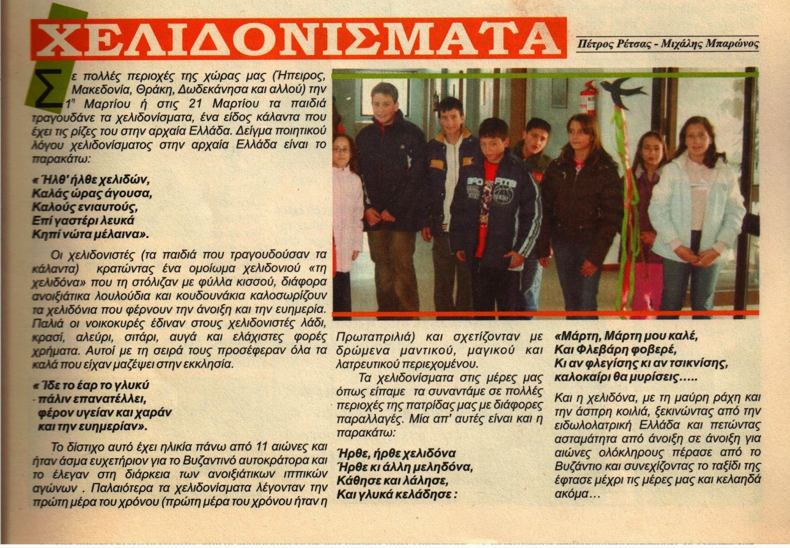 Οι χελιδονιστές (τα παιδιά που τραγουδούσαν τα κάλαντα) κρατώντας ένα ομοίωμα χελιδονιού “τη χελιδόνα” που τη στόλιζαν με φύλλα κισσού, διάφορα ανοιξιάτικα λουλούδια και κουδουνάκια καλωσορίζουν τα χελιδόνια που φέρνουν την άνοιξη και την ευημερία. Παλιά οι νοικοκυρές έδιναν στους χελιδονιστές λάδι, κρασί, αλεύρι, σιτάρι, αυγά και ελάχιστες φορές χρήματα. Αυτοί με τη σειρά τους προσέφεραν όλα τα καλά που είχαν μαζέψει στην εκκλησία.