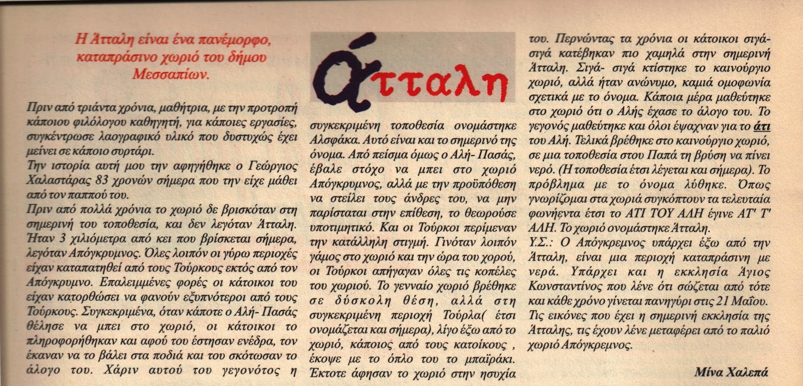 Υ.Σ.: Ο Απόγκρεμνος υπάρχει έξω από την Άτταλη, είναι μια περιοχή καταπράσινη με νερά. Υπάρχει και η εκκλησία Άγιος Κωνσταντίνος που λένε ότι σώζεται από τότε και κάθε χρόνο γίνεται πανηγύρι στις 21 Μαΐου. Τις εικόνες που έχει η σημερινή εκκλησία της Άτταλης, τις έχουν μεταφέρει από το παλιό χωριό Απόγκρεμνος.