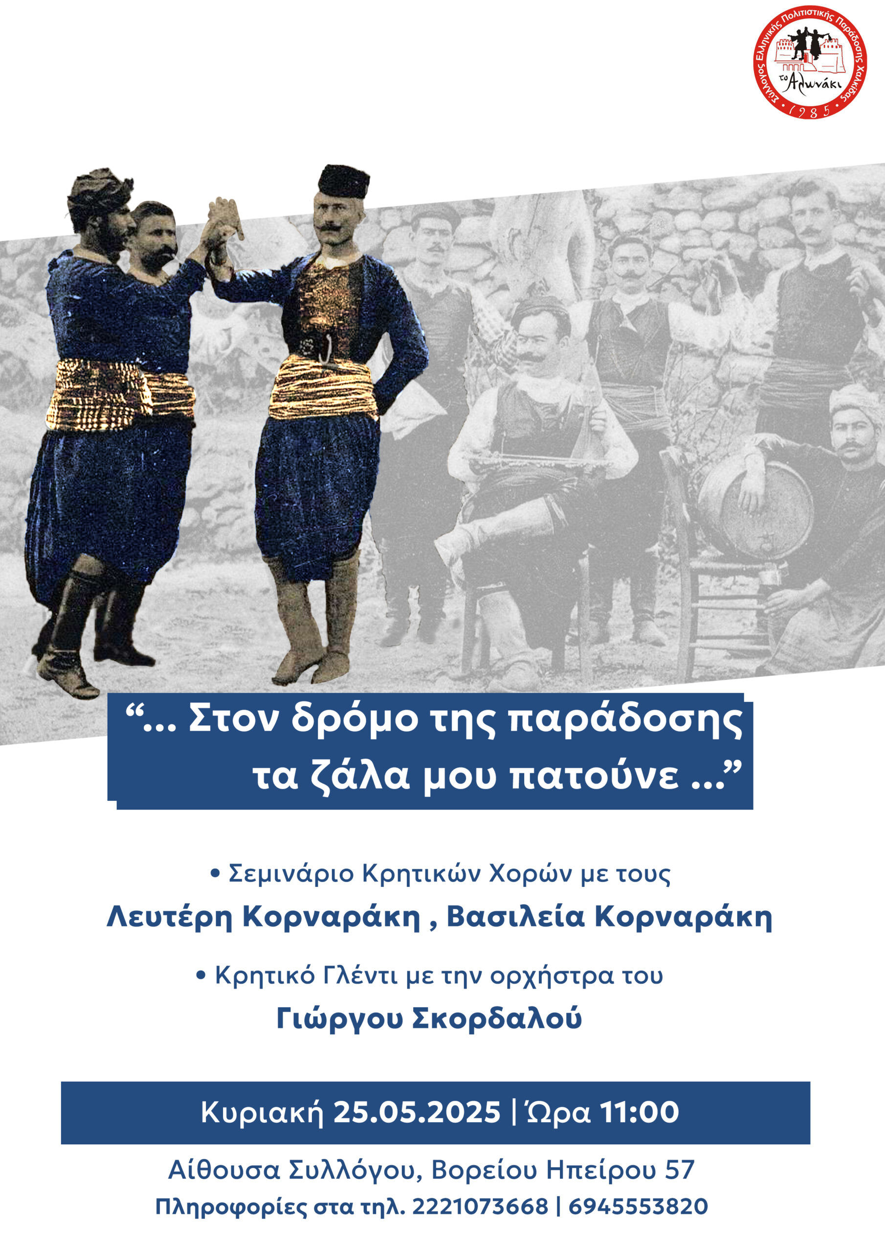 Στα πλαίσια της συνεχούς επιμόρφωσης, σε θέματα λαϊκού πολιτισμού, ο συλλογος μας «τ’ αλωνάκι», αυτή τη φορά ,συνεργεί και προσκαλεί τον Ελευθέριο Κορναράκη, καθηγητή φυσικής αγωγής, μελετητή-ερευνητή στην ελληνική λαογραφία, με καταγωγή από το Αμαριανό Ηρακλείου, και την Βασιλεία Κορναράκη, καθηγήτρια φυσικής αγωγής με ειδικότητα στον ελληνικό χορό. Σκοπός αυτής της συνέργειας η εκμάθηση, η κατηγοριοποίηση αλλά και η ανατροφοδότηση βασικών στοιχείων της κρητικής μουσικοχορευτικής παράδοσης.